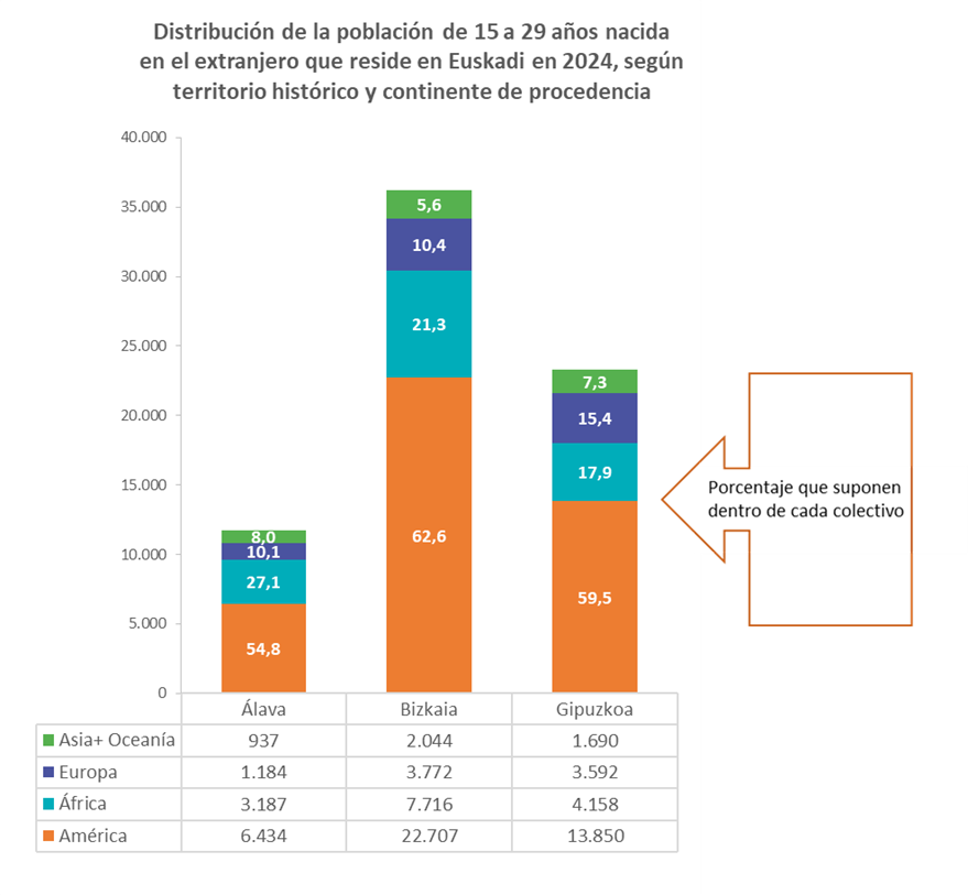 En los tres territorios históricos, la mayoría de la juventud nacida en el extranjero procede de América. En Bizkaia es donde estas personas tienen mayor peso absoluto y también relativo.