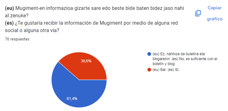 Hasta ahora nuestras herramientas más destacadas han sido la web, el blog, el boletín y la red social X. Antes de decidir qué dirección tomaremos en el futuro hemos querido conocer la opinión de los y las agentes y profesionales que trabajan en torno al proyecto Mugiment. En total hemos recibido 70 respuestas. Los resultados son los siguientes: