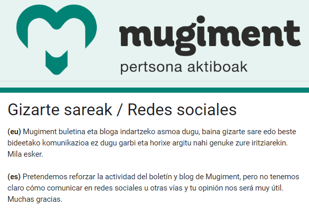 - Pertsonalki ari naiz erantzuten, nahikoa dut, badaki zer den Mugiment. Beste kontu bat da nola dabilen MUGIMENT herrira heltzen eta hortan bai uste dut komunikazio plan berezi bat diseinatu beharko zela.