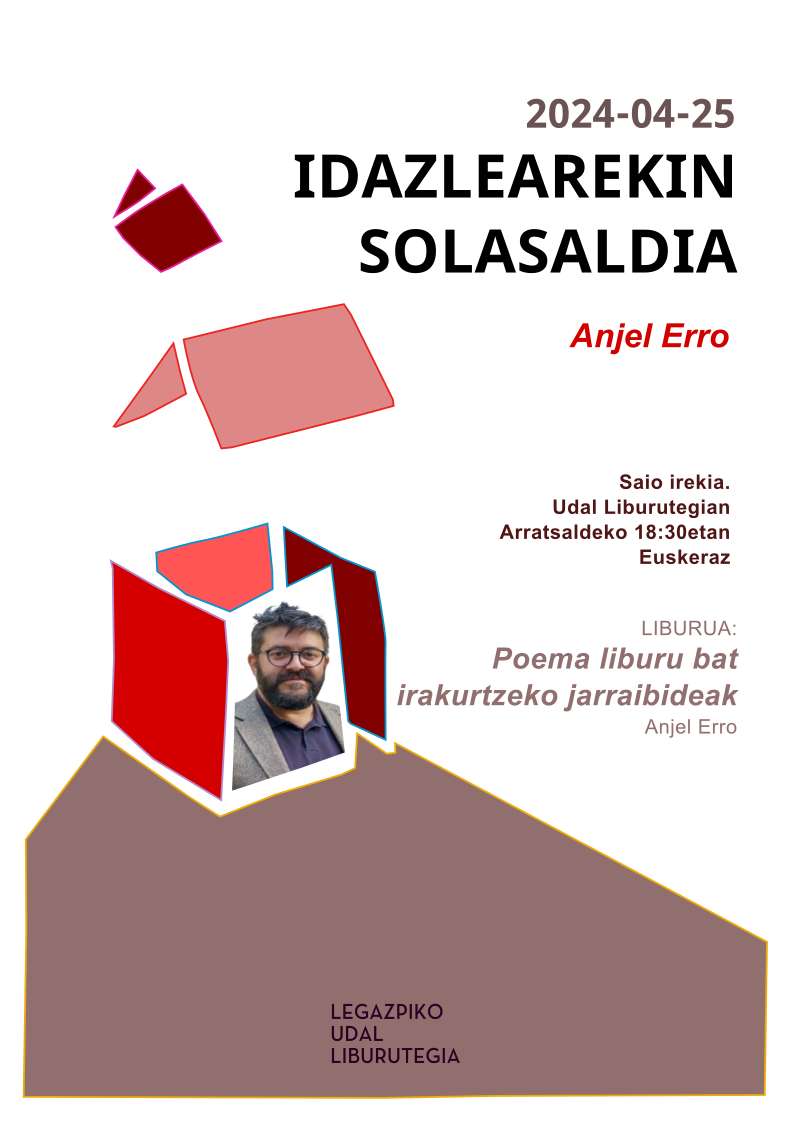 Después de haber leído durante este mes los poemas recogidos en el libro “Poema liburu bat : irakurtzeko jarraibideak” del escritor Angel Erro, los participantes charlarán sobre ellos en presencia del escritor.