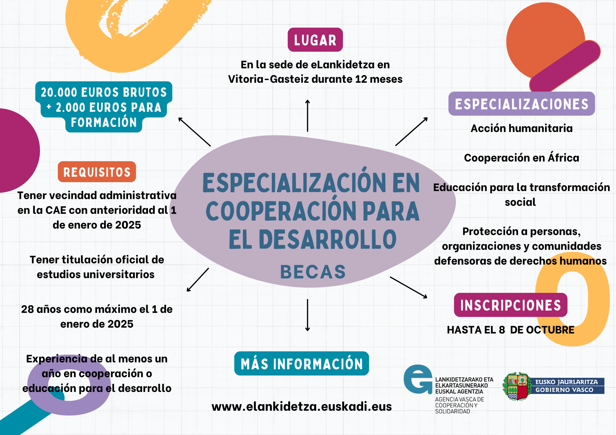 eLankidetza-Agencia Vasca de Cooperación y Solidaridad ha convocado recientemente cuatro becas de especialización y formación de profesionales en el área de cooperación para el desarrollo. Las especializaciones serán cooperación en África, acción humanitaria, educación para la transformación social y protección a personas, organizaciones y comunidades defensoras de derechos humanos.