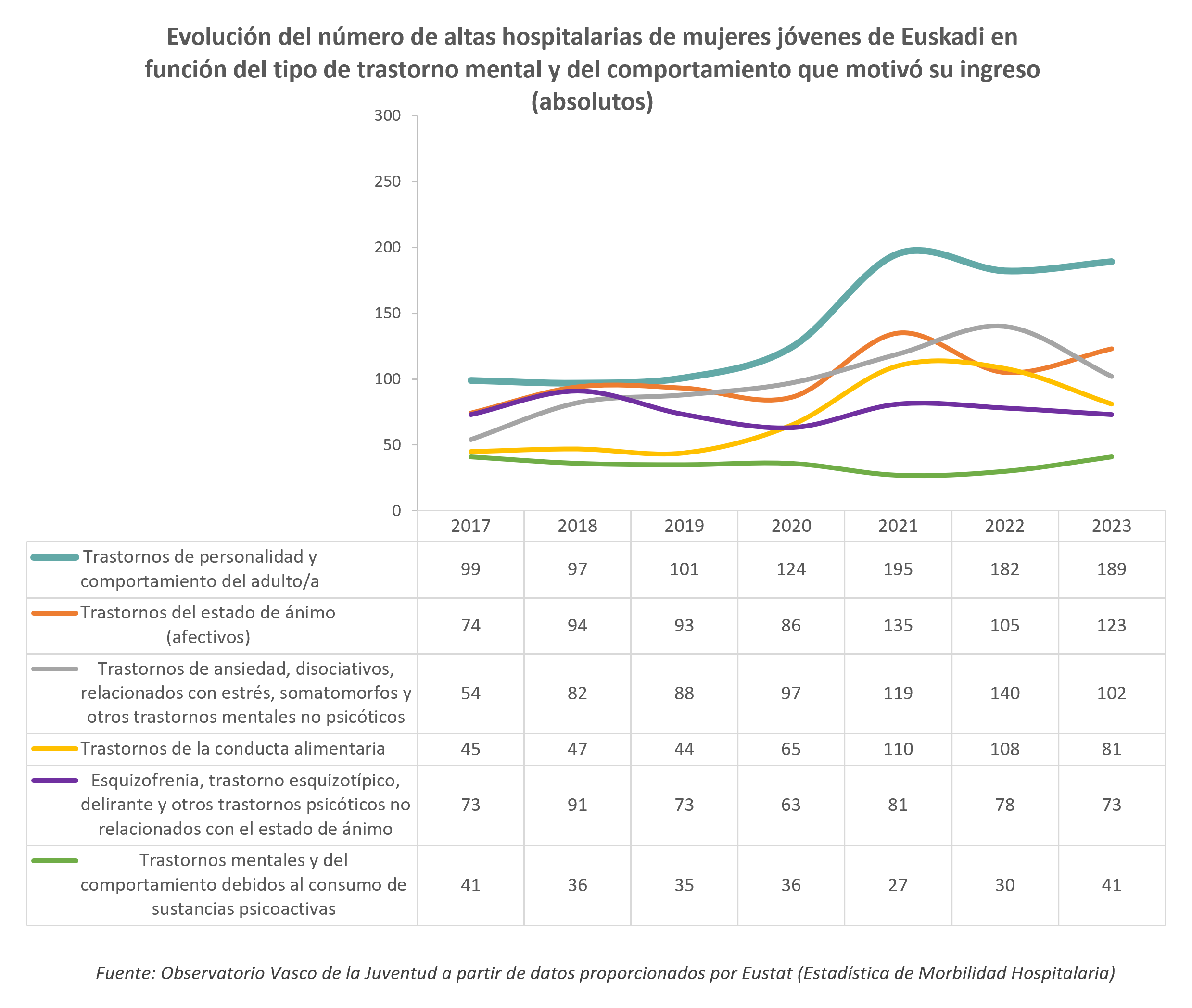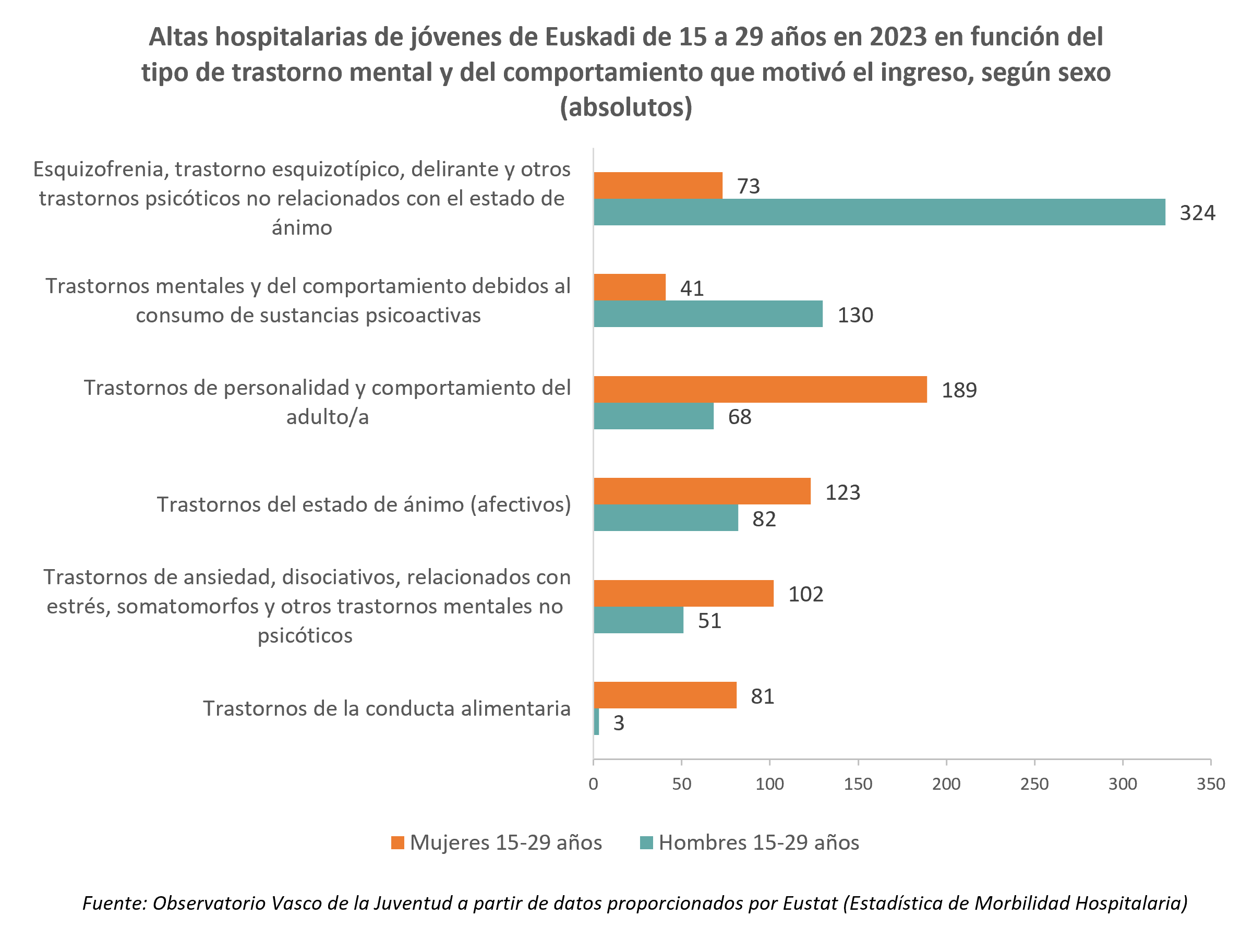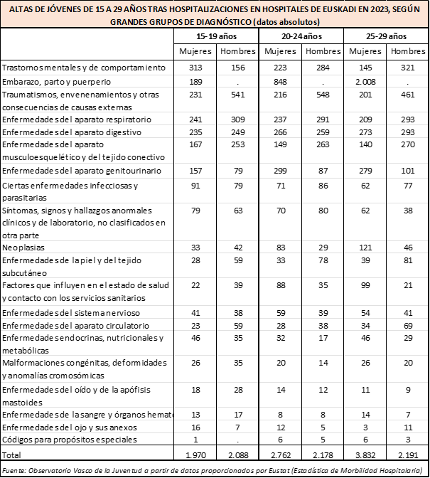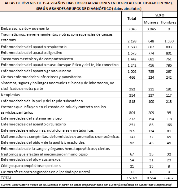 Los datos que se presentan a continuación proceden de la Estadística de Morbilidad Hospitalaria de Eustat. El Instituto Vasco de Estadística ha facilitado al Observatorio Vasco de la Juventud la información relativa a las personas jóvenes de 15 a 29 años.
