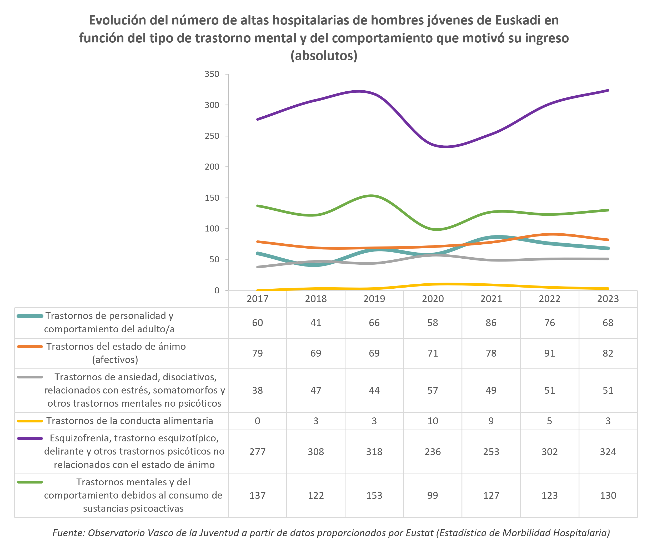 En todos estos años, el tipo de trastorno mental o del comportamiento que ha conllevado mayor número de hospitalizaciones de hombres jóvenes ha sido la esquizofrenia, trastorno esquizotípico, delirante y otros trastornos psicóticos no relacionados con el estado de ánimo. El segundo tipo de trastorno que ha motivado más hospitalizaciones de hombres jóvenes han sido los trastornos mentales y del comportamiento debidos al consumo de sustancias psicoactivas.