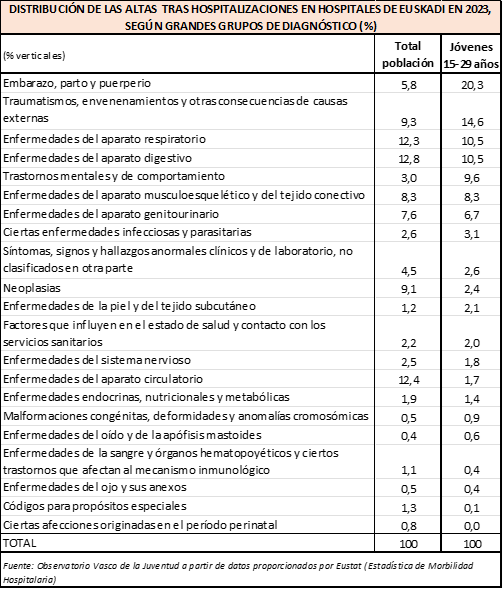 Si calculamos el porcentaje de personas que fueron dadas de alta en 2023 (último dato disponible) por cada uno de los grandes grupos de diagnóstico, vemos que en el conjunto de la población de Euskadi los más habituales son los ingresos derivados de enfermedades del aparato digestivo (suponen el 12,8 % del total de altas hospitalarias de ese año), del aparato circulatorio (12,4 %) y del aparato respiratorio (12,3 %), mientras que entre la juventud son más habituales las hospitalizaciones por embarazo, parto y puerperio (20,3 % del total de altas de ese año, aunque este diagnóstico solo afecta a las mujeres), así como por traumatismos, envenenamientos y otras consecuencias de causas externas (14,6 %).