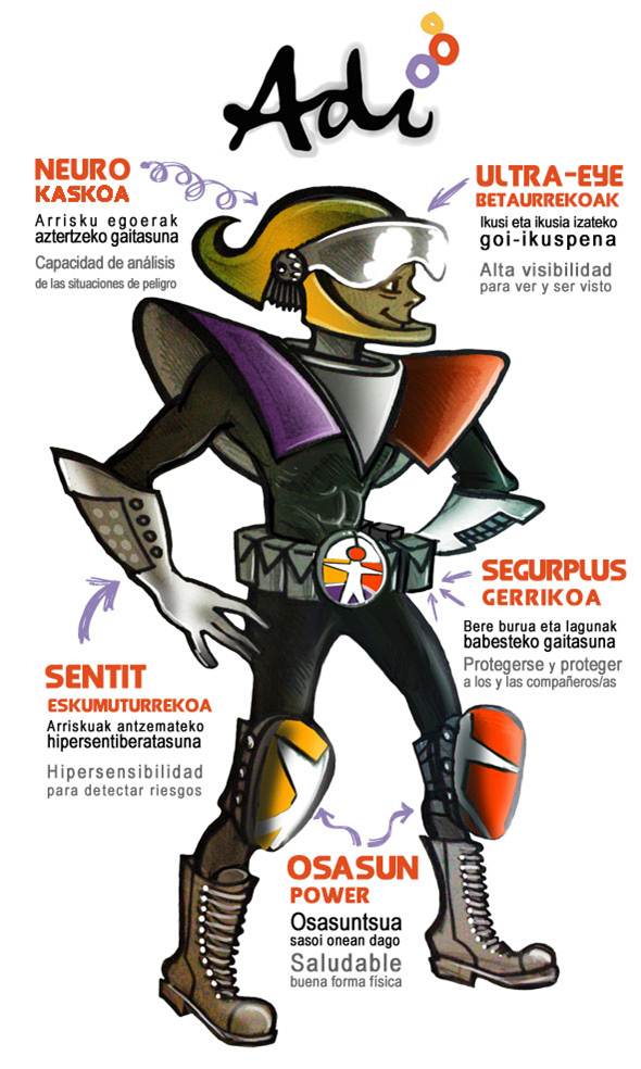 ADI es el nombre del personaje concienciado y comprometido con la prevención de riesgos laborales que gracias a sus poderes ayudará a los niños y niñas a superar las pruebas y actividades propuestas en el espacio. BALDAR es un ser que pasa por alto todo lo relacionado con la seguridad y salud laboral y que juega a torpedear a los participantes en las pruebas.