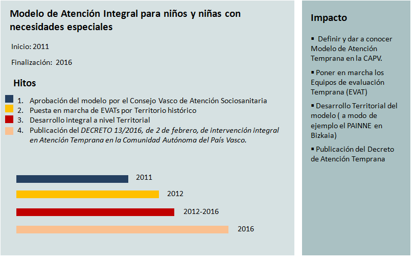 Definir el Modelo Atención Integrada a Niños y Niñas con Necesidades Especiales para Euskadi. Poner en marcha los Equipos de Valoración de Atención Temprana (EVAT). Asegurar la implantación efectiva del Modelo de Atención integrada a niños y niñas con necesidades especiales a nivel territorial. Desarrollar el Decreto de Atención temprana para Euskadi.
