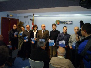 Patxi Baztarrika, Viceconsejero de Política Lingüística, Miren Dobaran, directora de Promoción del Euskera, Mikel Atxaga, coordinador de la colección Bidegileak, y los autores de los nuevos fascículos han presentado en Donostia-San Sebastián las dos nuevas carpetas de la colección.