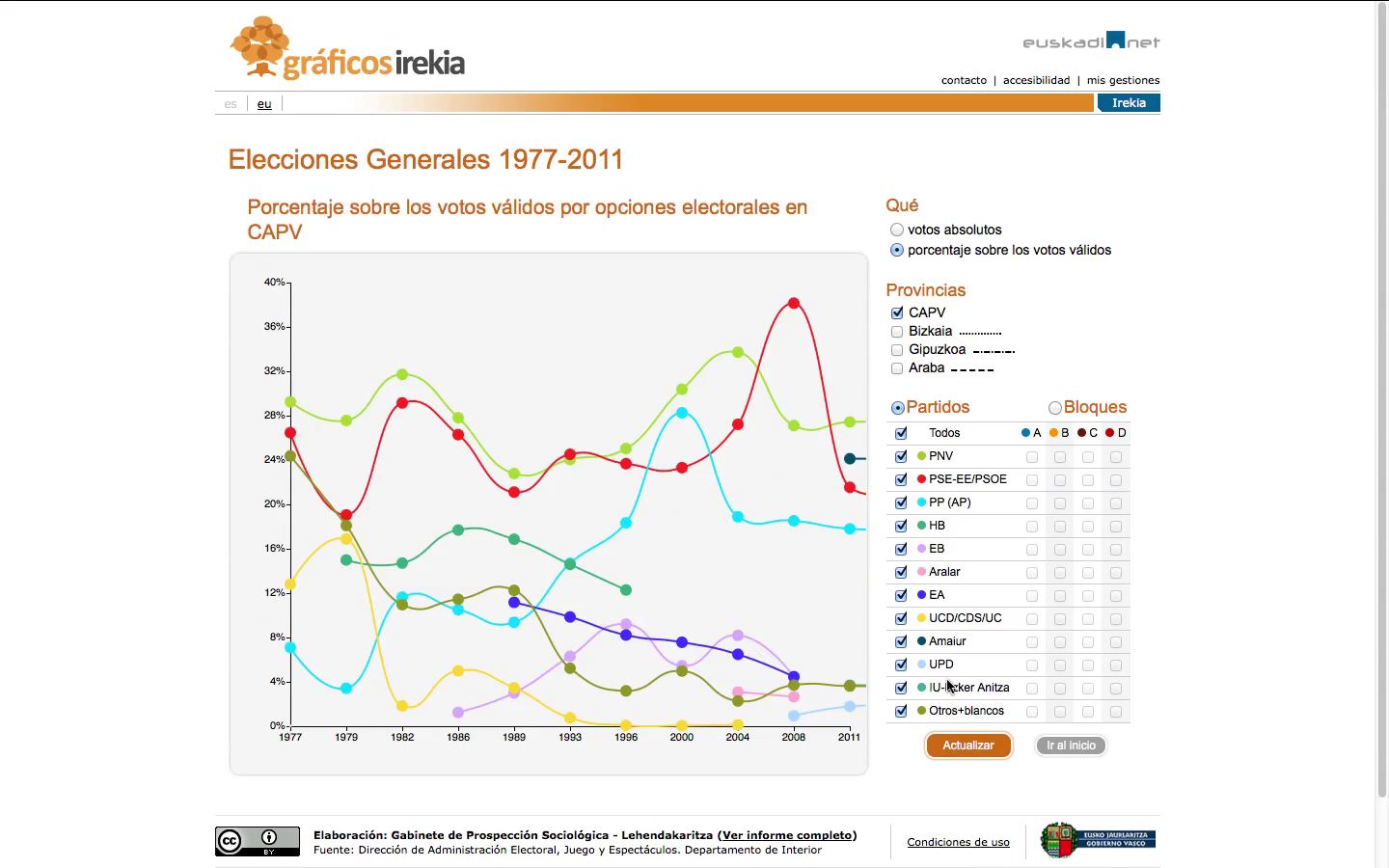 El Gobierno Vasco, a través del Gabinete de Prospección Sociológica, ha hecho público un informe de resultados de las Elecciones Generales del 20N, realizado a partir de los datos facilitados por el Departamento de Interior. En el propio informe se pondrán a disposición varios links a una página web interactiva (http://grafikoak.irekia.euskadi.net/es/charts) donde los datos se pueden consultar a través de una herramienta que permite que los usuarios crear fácilmente los gráficos que deseen sobre la evolución de los resultados obtenidos en las distintas elecciones generales que se han celebrado desde 1977 En esos gráficos se podrá elegir: Qué (votos absolutos o porcentajes sobre votos válidos), Dónde (CAPV y Territorios Históricos) y Quiénes (opciones electorales solas o agrupadas en bloques).