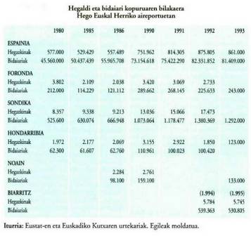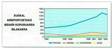 1990. urtean milioi bat bidaiari izatera iritsi zen lehenengo aldiz Bilboko aireportua. Azkeneko hamabost urteotan handituz joan da etengabe: 1980ean 525.600 bidaiari izan zituen, eta 1993rako, aldiz, 1.292.000. Hegaldi gehienak Espainia barrukoak dira, baina bidaiarien %24 nazioarteko hegaldietara lotzen dira gero. Izan ere, Hego Euskal Herriko nazioarteko aireportua,Forondako nazioarteko charter hegaldiak eta Noaineko aireportutik ateratzen diren nazioarteko hegaldi erregularrak gorabehera, Sondikakoa da.