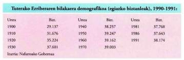 Tuterako Erribera oso eskualde bizia da demografiaren aldetik. Biztanleria ia etengabe hazi da mende honetan. Hazkunde hori handia izan da 70eko hamarraldia arte; harrezkeroztik gutxi gorabehera bere horretan iraun du biztanle kopuruak. Hiriburuan ordea, Tutetan, Nafarroako bigarren hiri jendetsuenean, biztanleriaren bilakaera bestelakoa izan da: 1940 inguru arte, hazkundea eskualdearena baino zertxobait apalagoa izan zuen, baina 1960tik aurrera biztanle kopurua asko eta etengabe hazi da 1991 arte (26.163 biztanle). Urte hartan ia bikoiztua zuen mende erdialdeko biztanle kopurua. Gainerako udalerrien artean bereizkuntza bat egin daiteke; alde batetik ekonomia batez ere laboreetan oinarritua dutenak; herri horietan biztanle kopuruak nabarmen egin du behera —Queilesko ibarreko udalerri txikiak, Carcastillo, Fitero, Fustiñana, Marcilla, Milagro, Santacara, Murillo el Fruto—, eta bestetik, ureztatze sailak dituzten udalerriak, biztanle kopuru berari eutsi diotenak edo industrializazioaren eraginez hazkundea izan dutenak -Ablitas, Buñuel, Cintruenigo-. Tuterak bereganatu ditu, eskualdeko hiriburua baita, landa aldetik hirira joaten diren biztanle gehienak. Eskualde osoak biztanle kontzentrazio maila handia du. Udalerri gehienak handi-txikian erdi mailakoak dira, 2.000 biztanle baino gehiago ditu udalerrien %70ak. Babes beharrak baldintzatu du batez ere herrien kokagunea; gehienak alubioiek eratutako terrazen gainean daude, uholdeen irispidetik urrun eta ureztatze sailak eta lehortekoak elkartzen diren gunean.