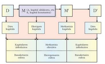 Kapitalista diru kapitalaren jabea da eta diruzko kapitalaz ekoizpen kapitala sortzen du, alegia, ekoizpen bitartekoak (makinak), kapital konstante deritzona (K), eta lansariak, kapital aldakorra (A) izenekoa. Kapital konstantea eta kapital aldakorra elkartuta merkantziak lor daitezke; M ekoizpen kapitalaz M’ merkantzia lortzen da (merkantzia kapitala). Merkantzia horrek D’ diru balioa dauka, hasierako D diru balioa baino handiagoa.