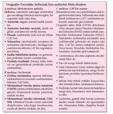 Hurrengo orriotan aztertuko dira Arantzelei eta Merkataritzari buruzko Akordio Orokor (GATT) horren bilkuretan ezarritako arautze mekanismoak eta horrelakoen gabeziak Erdigunea/Periferia ekonomia harremanak gobernatzeko, eta baita Munduko Merkataritza Erakundea sortutakoan nazioarteko merkataritza arautzeari irekitako itxaropen berriak ere.