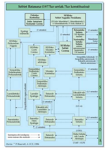 Botere politikoaren funtsezko organoa Sobiet Gorena da, nazio sobieten ordezkariek osatutako biltzarra alegia; honetatik sortzen dira beste organoak, hala nola betearazlea, judiziala eta legegilea. Ez dago botereak bereizteko eta banantzeko printzipiorik.