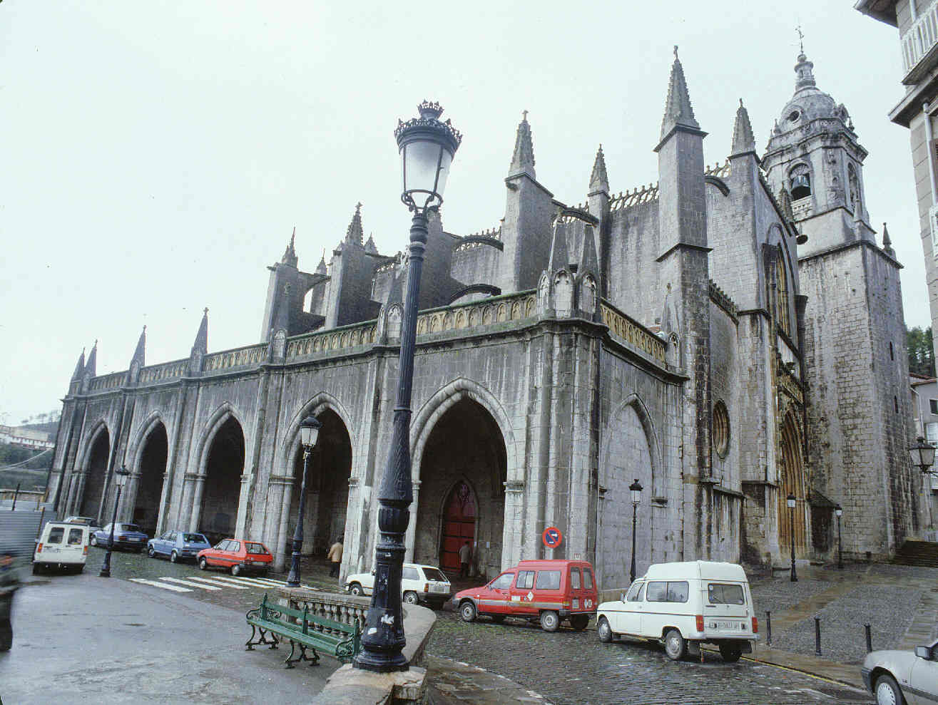 La villa de Gernika se fundó sobre los terrenos de la anteiglesia de Lumo en 1.366. La Iglesia de Santa María es anterior a la fundación de la villa ya que antes de ser mencionada en la carta puebla como Monasterio de Sarospe, aparece en 1.051 en un documento de donación a San Millán de la Cogolla. Suponemos que este templo se encontraba intramuros debido a que está ubicado en una de las esquinas del casco urbano, a modo de vértice, y sus muros bien pudieran ofrecer defensa frente a la tierra llana. En la actualidad el único elemento antiguo del casco es la iglesia puesto que el resto fue destruido en el bombardeo. Tras la reconstrucción realizada por el organismo de regiones devastadas, la villa que surgió poco tiene que ver con la medieval ya que aunque mantiene el mismo numero de calles, éstas fueron modificadas en anchura y alineación, variando la parcelación y ordenación de las viviendas.