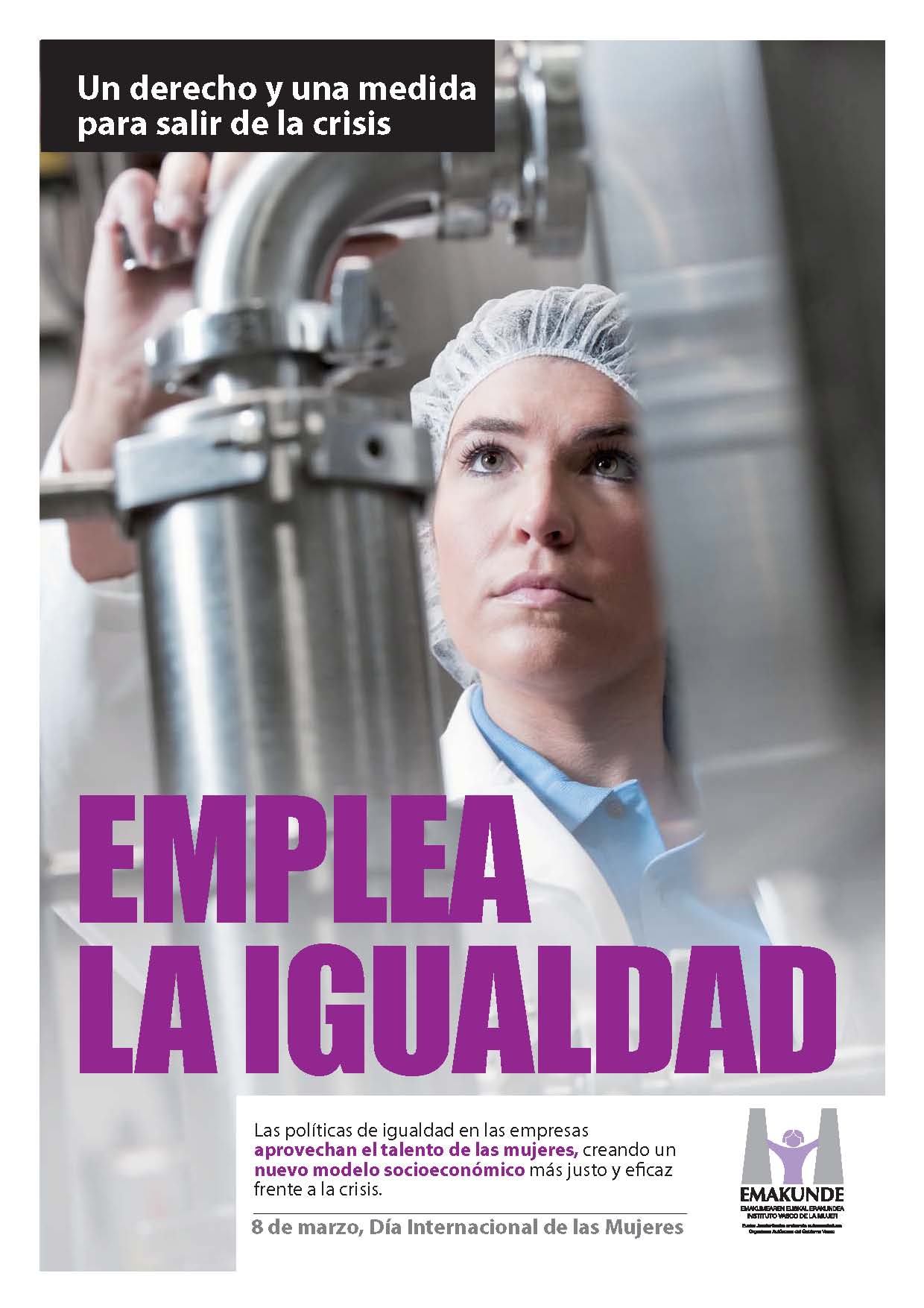 La campaña que Emakunde/Instituto Vasco de la Mujer ha diseñado para el 8 de marzo de 2012 se centra en la igualdad de oportunidades de mujeres y hombres en el ámbito económico y empresarial, incidiendo en la empleabilidad de las mujeres como una de las vías para salir de la crisis. La idea general es vincular las políticas de igualdad con el contexto de crisis económica en un sentido positivo, es decir, con el mensaje de que las políticas de igualdad pueden contribuir a definir un nuevo modelo socioeconómico y un nuevo tejido de producción que ayude a esta sociedad a salir de la crisis.
