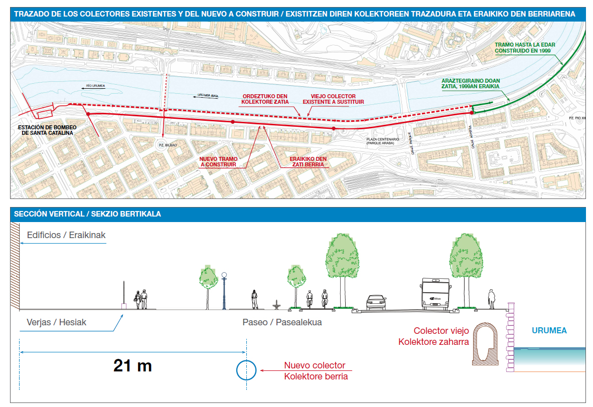 El trazado del nuevo colector discurrirá paralelo al río Urumeaa lo largo de los Paseos de los Fueros, Árbol de Gernika y Bizkaia;la conducción irá alojada a una profundidad que variará entre 5,26 m y 6,58 m y presentará una pendiente constante del 2 por mil. Se han construido ya dos pozos de los cuatro pozos (en la esquina de la calle Azpeitia y Paseo Bizkaia; en el extremo norte del Parque Araba; junto al Colegio San José del Paseo Árbol de Gernika; y al comienzo del Paseo de los Fueros)para la introducción y salida de la máquina de hinca, así como para el descenso de los correspondientes tubos.
