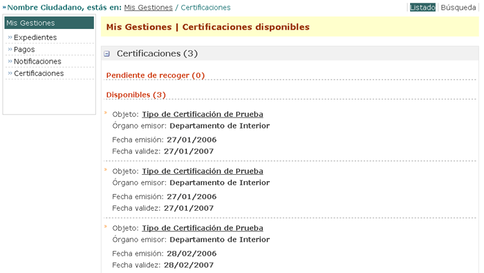 Este apartado muestra las certificaciones. Está clasificado en certificaciones pendientes de recoger y disponibles.