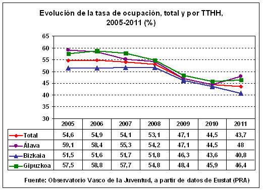 La tasa de ocupación de la población activa de 16 a 29 años ha sido en 2011 del 43,7%, alcanzando en el colectivo de mujeres jóvenes el 44,7% y en el de los hombres el 42,8%.