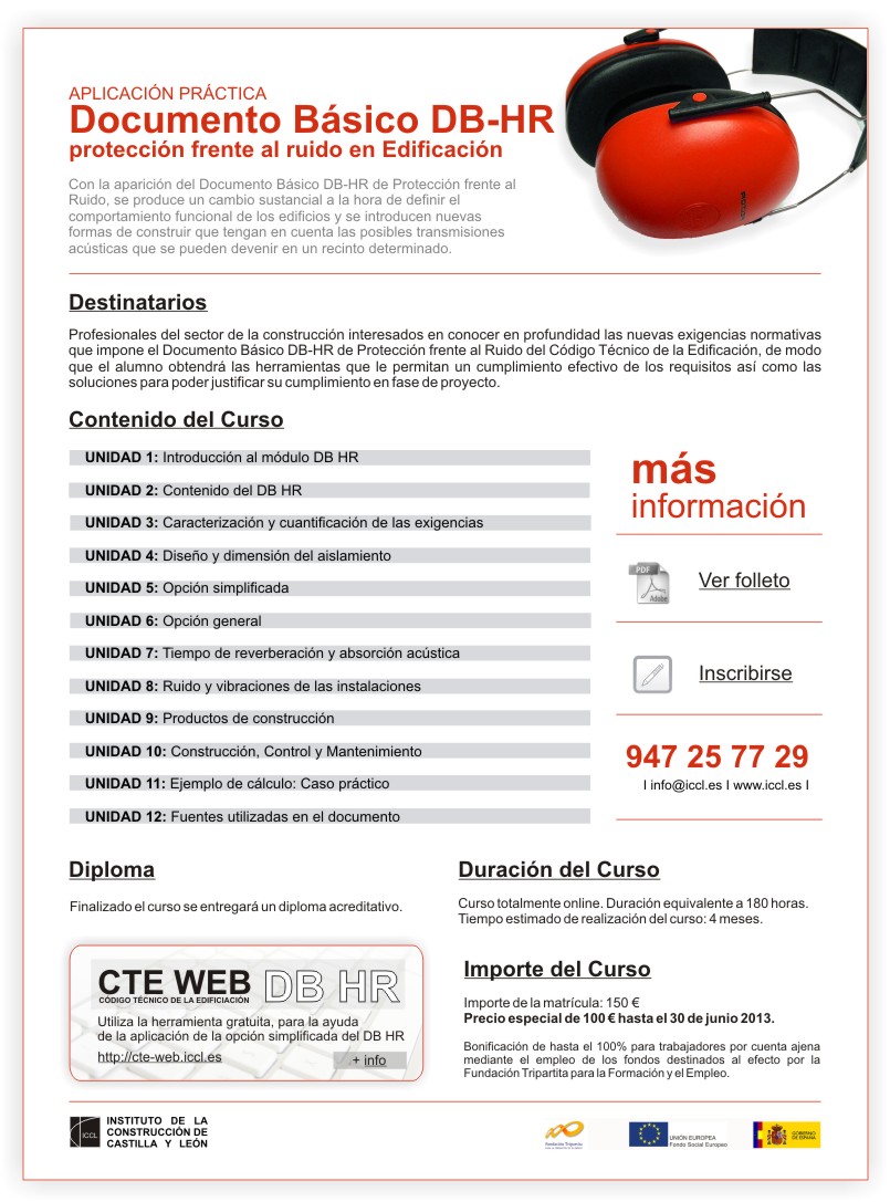 El objetivo del curso es ampliar la formación de los técnicos para conocer en profundidad las nuevas exigencias normativas que impone el Documento Básico DB-HR de Protección frente al Ruido del CTE, de modo que el alumno disponga de herramientas que le permitan un cumplimiento efectivo de los requisitos así como de conocer las soluciones para poder justificar su cumplimiento en fase de proyecto. Los alumnos irán profundizando en dicho documento para una vez llegado a su pleno conocimiento, poder realizar ejercicios de aplicación utilizando tanto la opción simplificada como la opción general