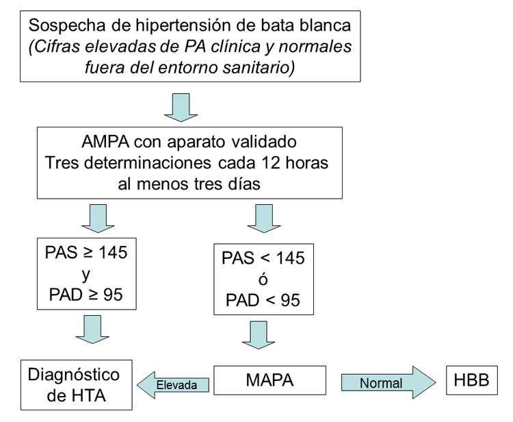 Ante pacientes con sospecha de HBB podemos utilizar la AMPA pero en este caso modificando sus valores para confirmar una HTA ya que en estos pacientes las cifras de PA consideradas como normales (135/85) no permiten clasificar correctamente a los pacientes.