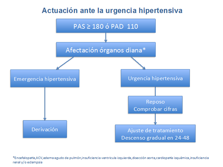 - Urgencia hipertensiva se define como la elevación de la PA (PA >180/110 mmHg) sin afectación de órgano diana (encefalopatía hipertensiva, ACV, edema agudo pulmón, insuficiencia ventricular izquierda, disección aórtica, cardiopatía isquémica, insuficiencia renal y/o eclampsia). Cuando además existe afectación de los órganos diana hablamos de emergencia hipertensiva.