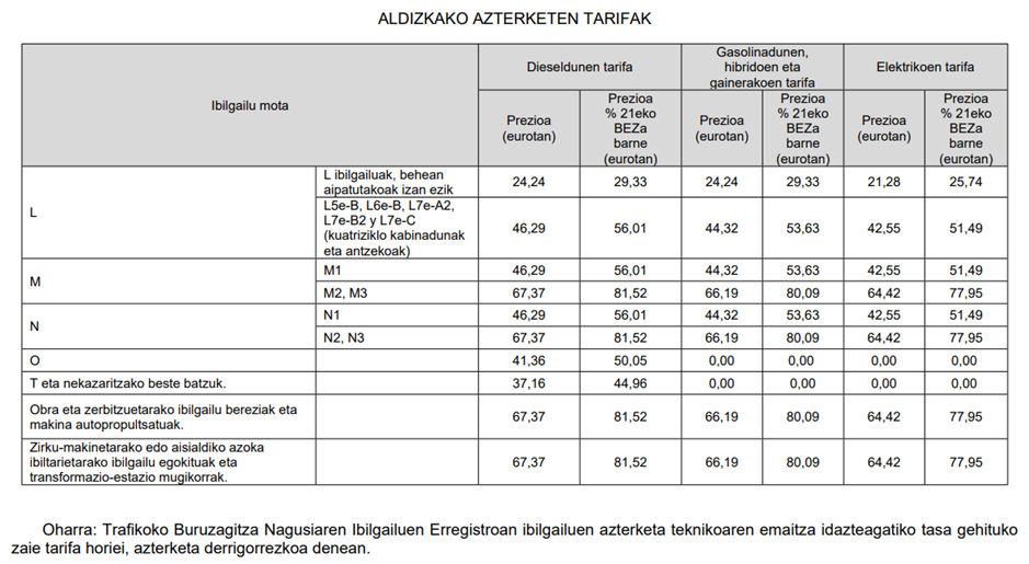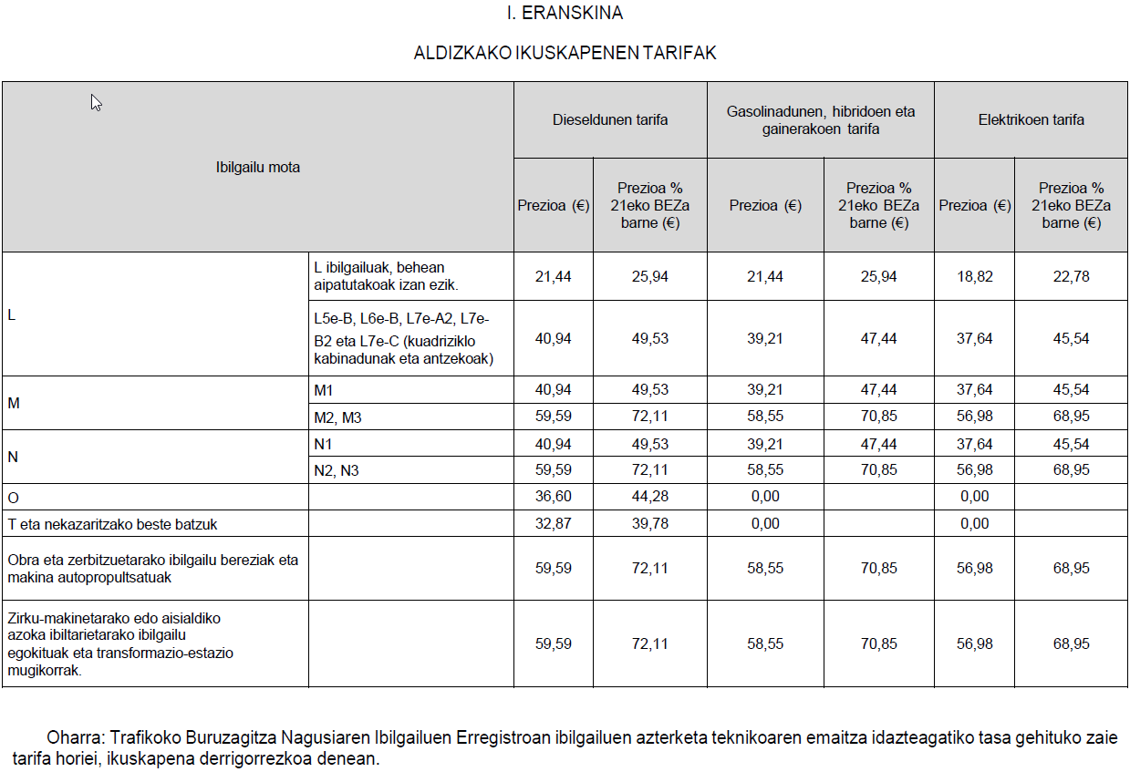 | L | L1e: Ziklomotorrak: Bi gurpileko ibilgailuak, 45 km/h-ko gehieneko abiadura daukatenak eta motoreak 50 cm³-ko zilindro-bolumena edo txikiagoa, barne-errekuntzakoa baldin bada, edo gehienez ere 4 kW-eko edo hortik beherako etengabeko potentzia izendatua, motor elektrikoa baldin badute. | 3 urte bete arte: Salbuetsita. | 3 urtetik gora: 2 urtean behin. |