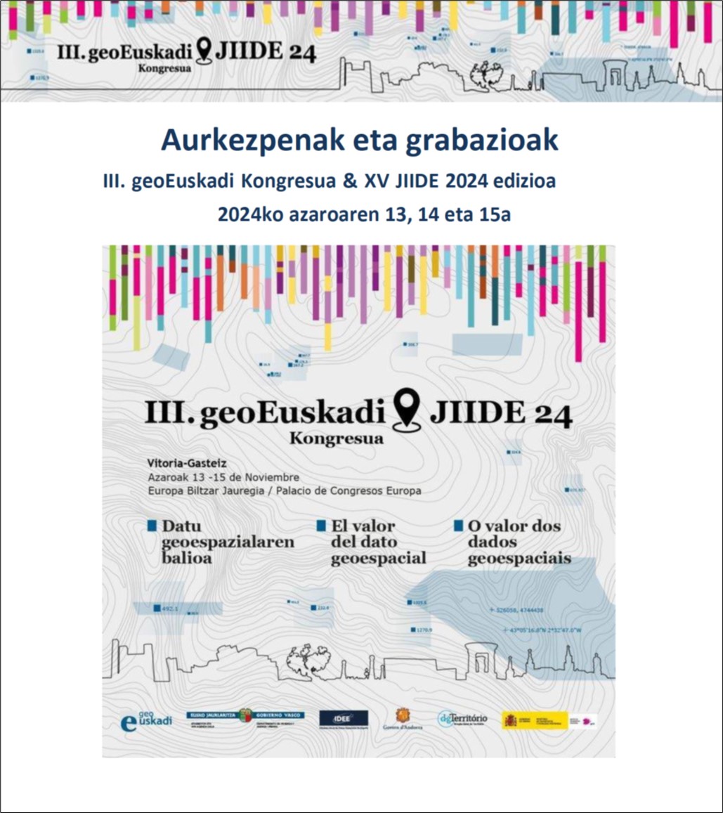 III geoEuskadi Kongresua Datu Espazialen Azpiegituren Iberiar Jardunaldien (JIIDE) XV. edizioarekin batera egin zen 2024ko azaroaren 13tik 15era Europa Biltzar Jauregian (Vitoria-Gasteiz).
