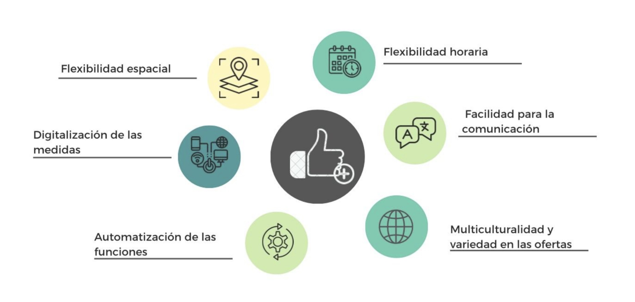 - Muy enlazado con la flexibilidad horaria, se encuentra la facilidad para la flexibilidad espacial que proporcionan las tecnologías en las empresas. Herramientas como las videoconferencias, permiten realizar las distintas tareas desde cualquier lugar. En 2020, impulsado por el COVID-19, se implementaron además en un gran número de empresas medidas como el teletrabajo, que son posibles gracias a la tecnología y permiten llevar a cabo gran variedad de tareas sin la necesidad de acudir de forma presencial a las instalaciones de la organización, proporcionando un gran número de beneficios a las personas para adecuar sus trabajos a su vida personal (María Belén Fernandez, 2021). Pese a tratarse de medidas que se vieron en gran parte impulsadas por la situación de alarma, el 50% de las grandes empresas ya contaban con planes previos para la digitalización, si bien en muchos casos no se han mantenido.