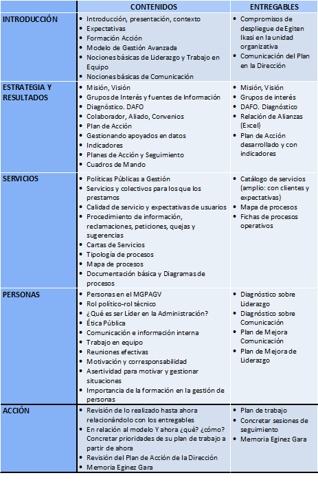 • Diseño colaborativo. Para trabajar en el diseño de Egiten Ikasi se constituyó un grupo de trabajo con la participación de representantes de la Dirección de Atención a la Ciudadanía e Innovación y Mejora de la Administración, del Instituto Vasco de Administración Pública, y de la Dirección de Función Pública. EUSKALIT, Fundación Vasca para el Fomento de la Calidad, aportó su experiencia acumulada en la organización y el desarrollo de los cursos KnowInn de formación-acción. A continuación se contrastó la estructura y el contenido en sesiones con Direcciones de Servicio, Responsables de Servicio y personal técnico que hicieron aportaciones que sirvieron para mejorar la propuesta inicial.
