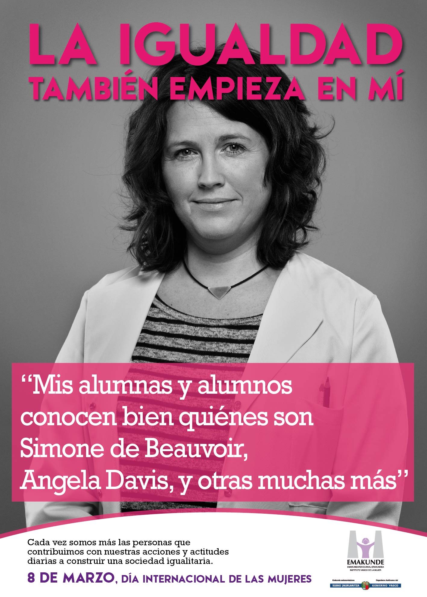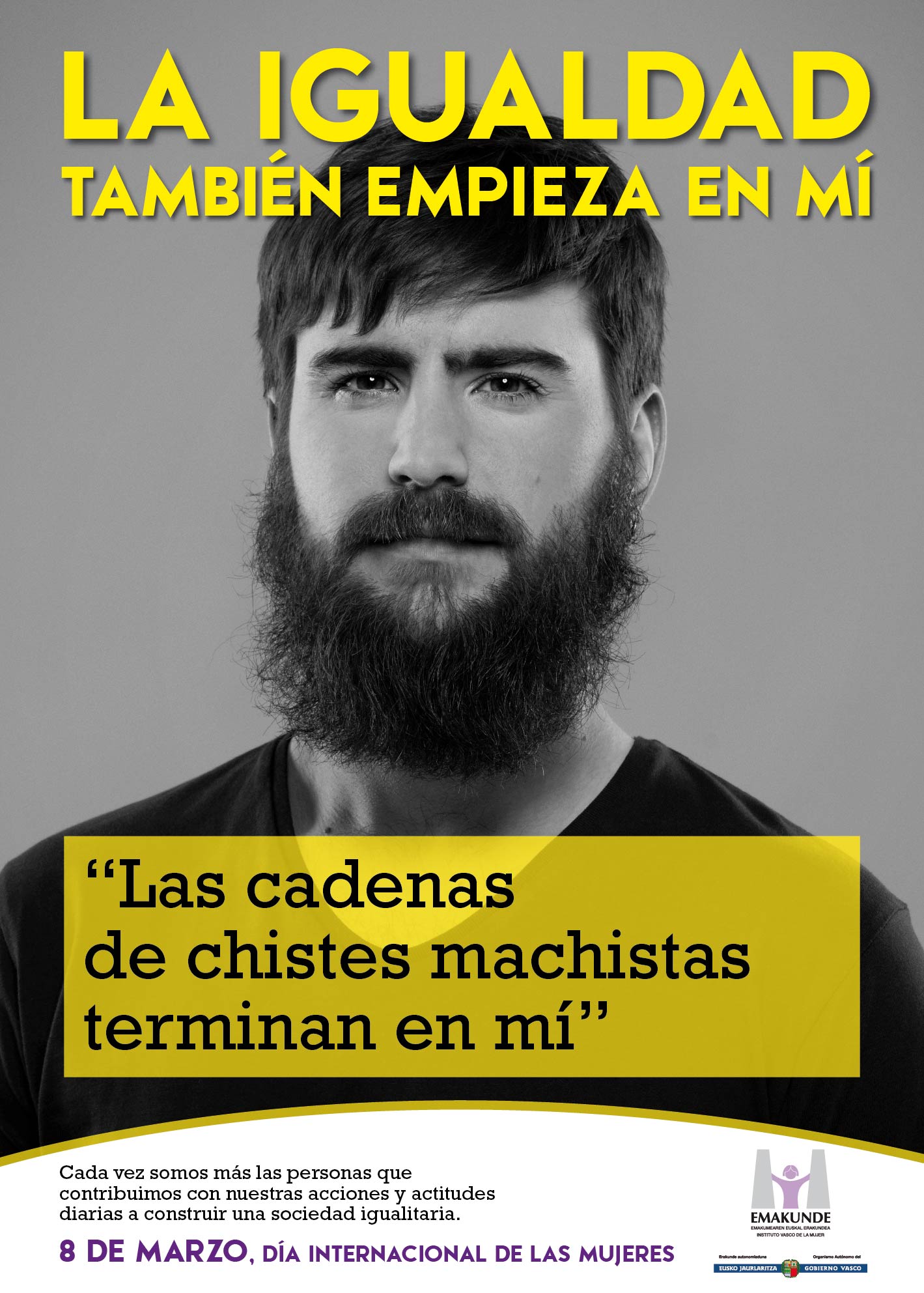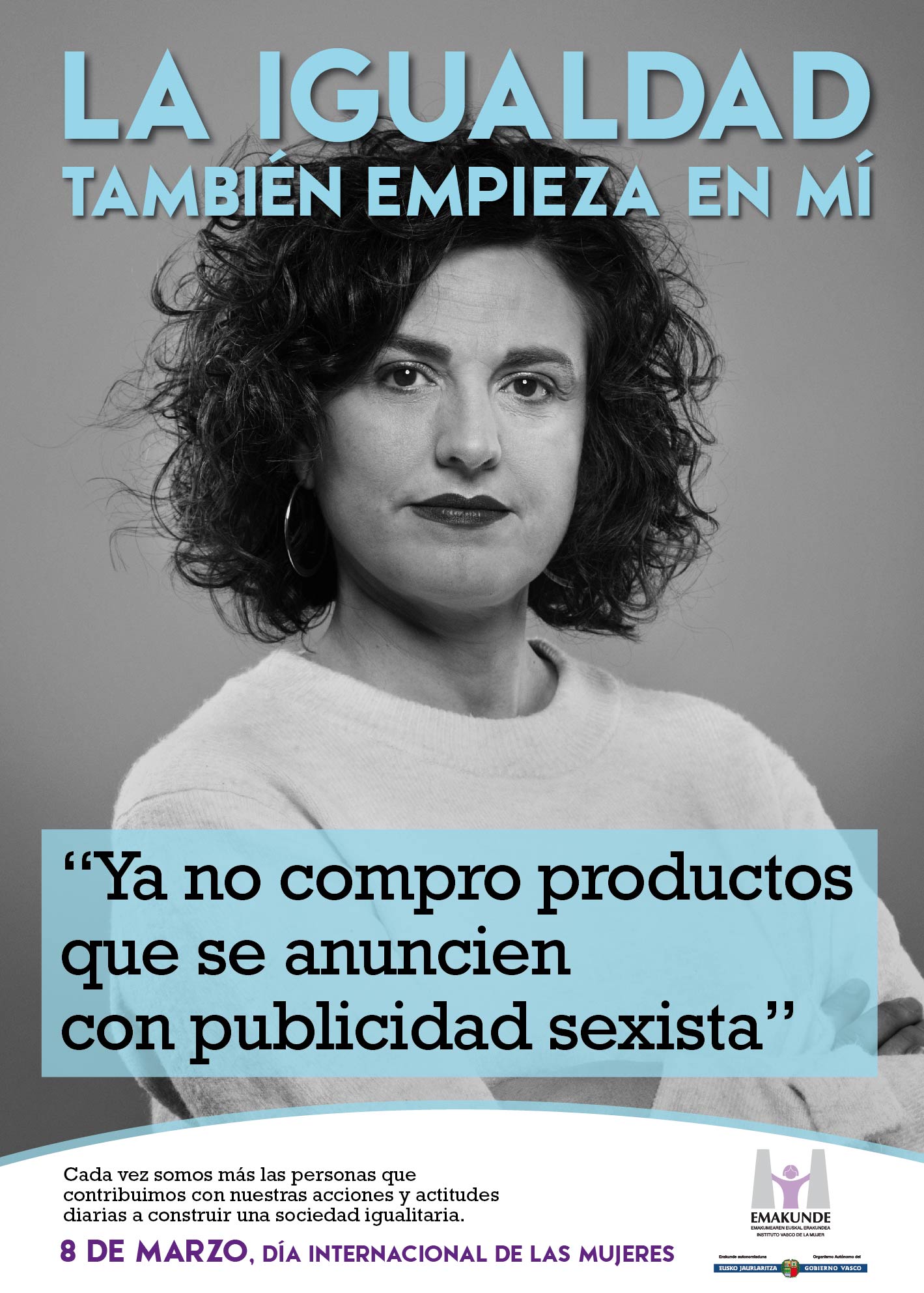 La campaña del 8 de Marzo, Día Internacional de las Mujeres, diseñada por Emakunde fija este año la mirada en las actitudes personales que fomentan la igualdad en nuestra sociedad. El lema de la campaña es “La igualdad también empieza en mí” y muestra ejemplos de personas que han decidido actuar a favor de la igualdad a través de distintas actitudes o acciones llevadas a cabo en su entorno más cercano.