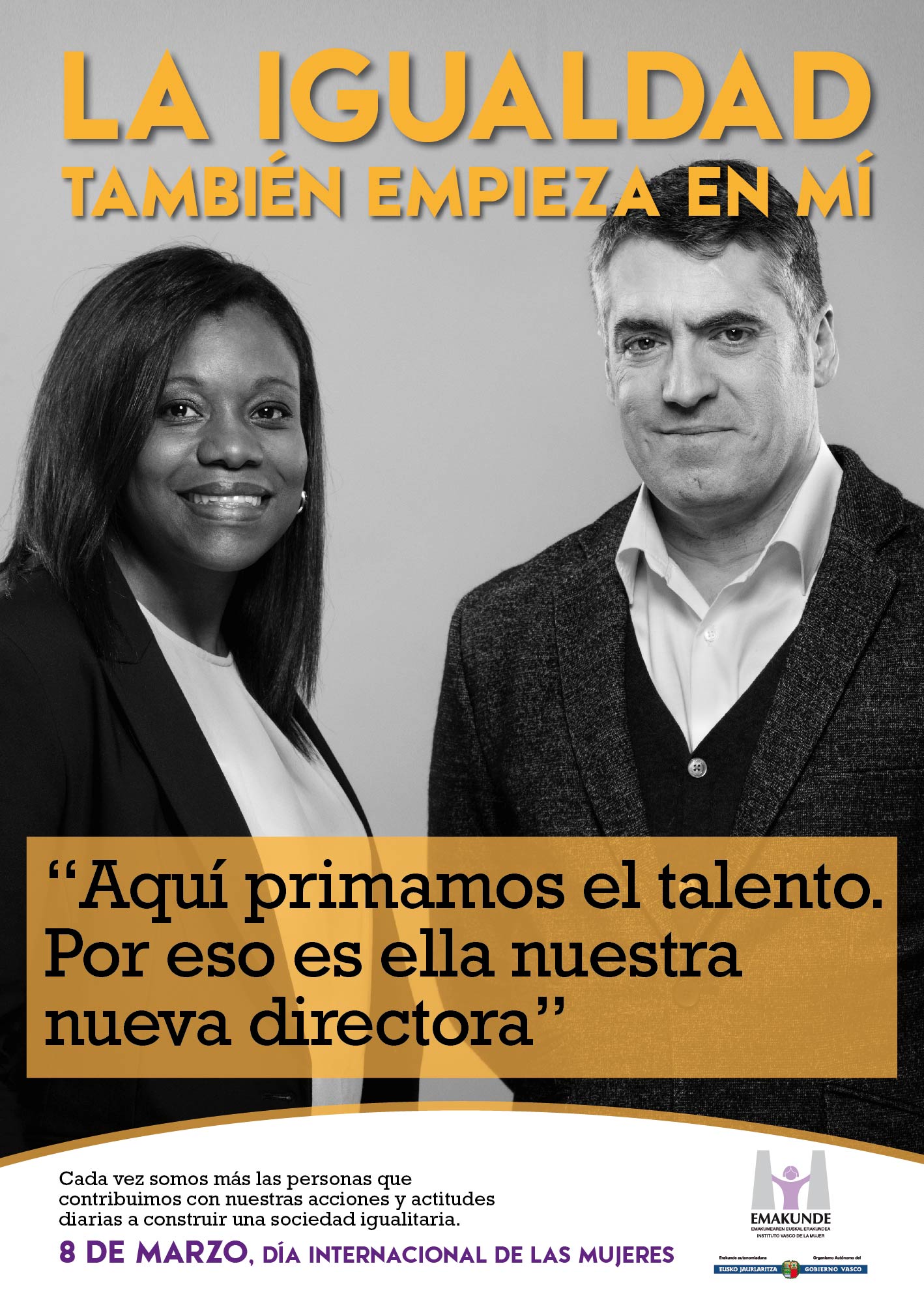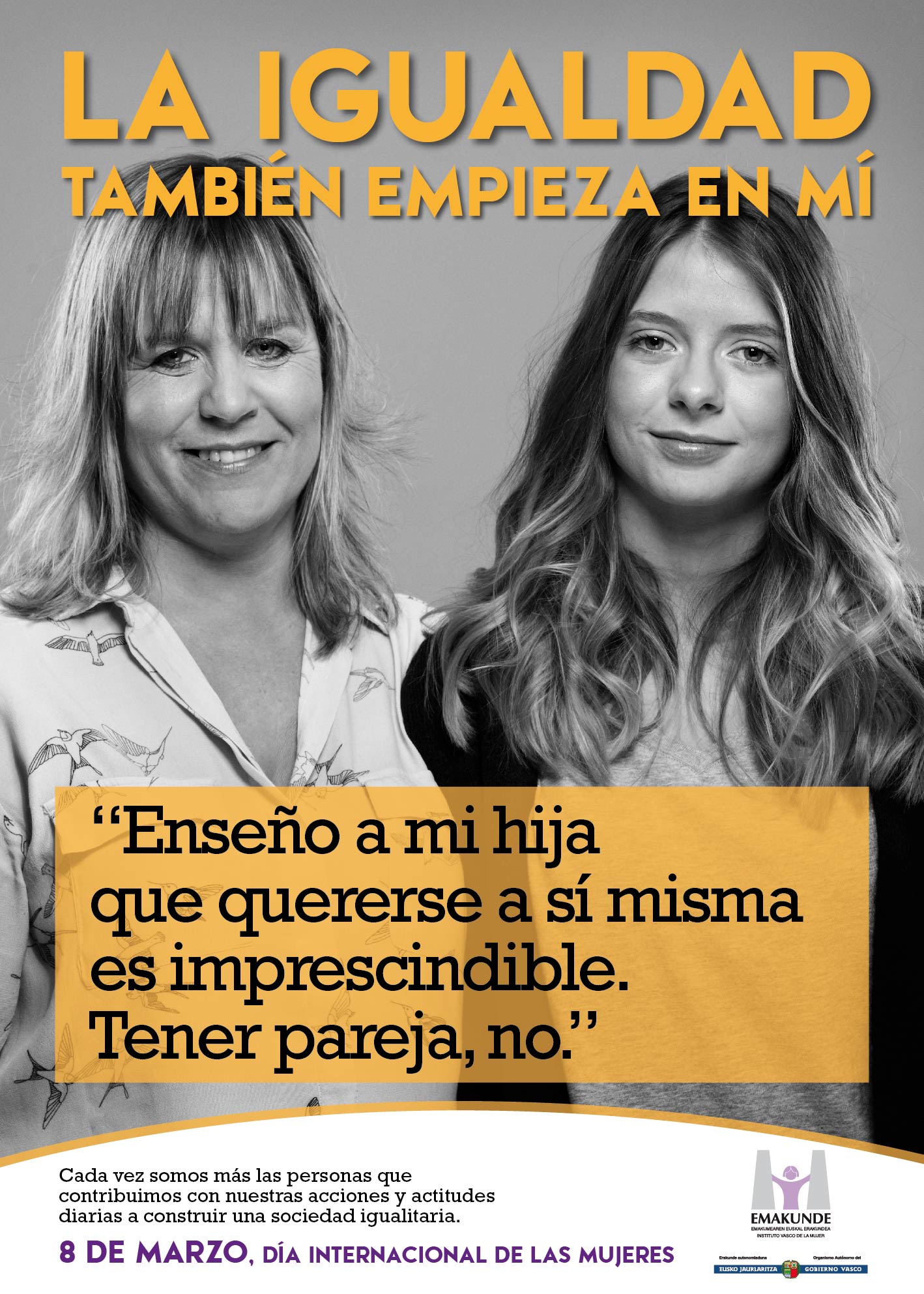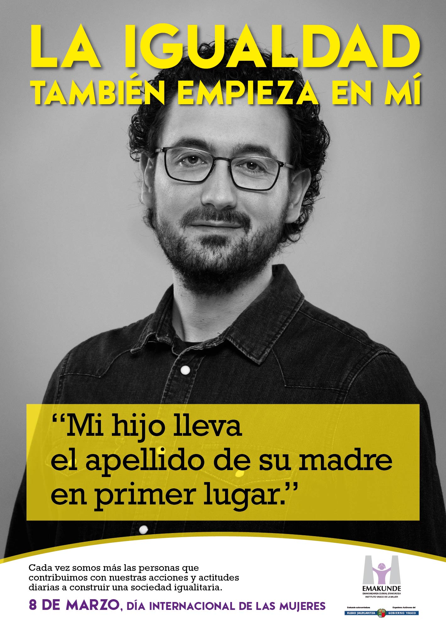La campaña del 8 de Marzo, Día Internacional de las Mujeres, diseñada por Emakunde fija este año la mirada en las actitudes personales que fomentan la igualdad en nuestra sociedad. El lema de la campaña es “La igualdad también empieza en mí” y muestra ejemplos de personas que han decidido actuar a favor de la igualdad a través de distintas actitudes o acciones llevadas a cabo en su entorno más cercano.
