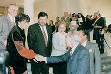 El Lehendakari Ardanza, recibió a cada uno de los miembros de los Centros Vascos que participaron en este encuentro. En la foto, el Lehendakari saluda a Pedro Leguina, de la Fundación Vasco Chilena, mientras los delegados de Uruguay esperan su turno. |
