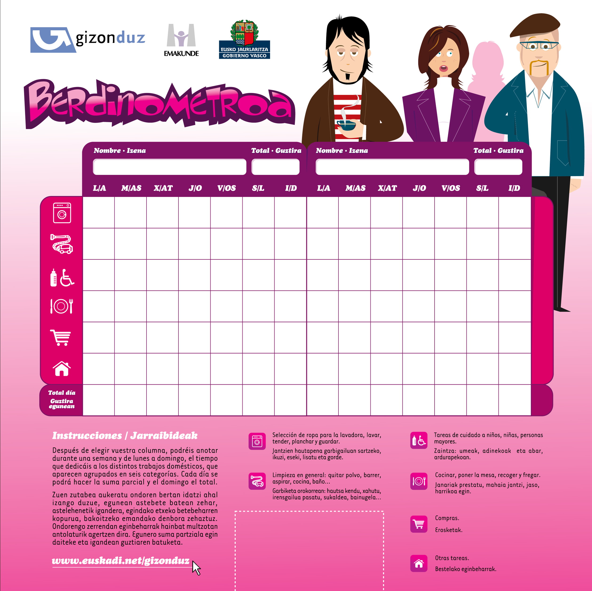 - Berdinometroa (JPG, 800 KB): Se trata de un “juego” que permite de una forma divertida comprobar y hacer visible cómo es el reparto de las tareas domésticas en la pareja y facilitar, en su caso, un reparto más equilibrado de éstas.