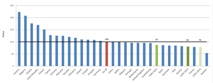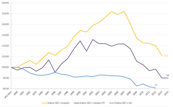 Las emisiones de la CAV por habitante en 2012 son ligeramente superiores a la media de EU-28. Sin embargo, las emisiones en 2013 y 2014 han descendido.