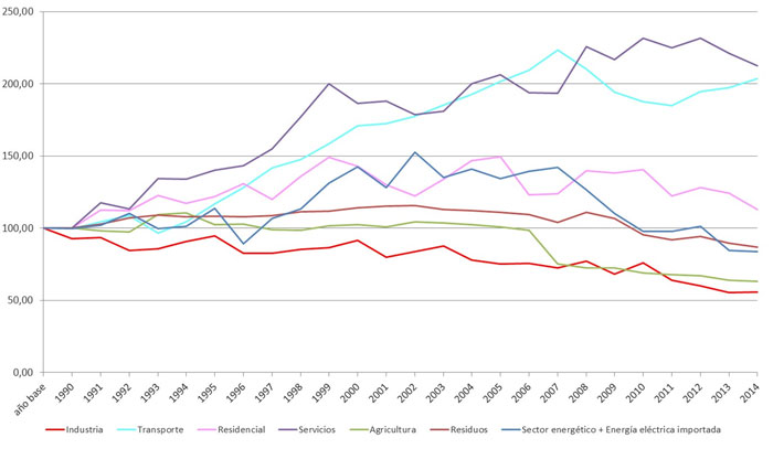 Los sectores que más han disminuido sus emisiones desde 1990 son el industrial y el agrícola, así como el sector residuos.