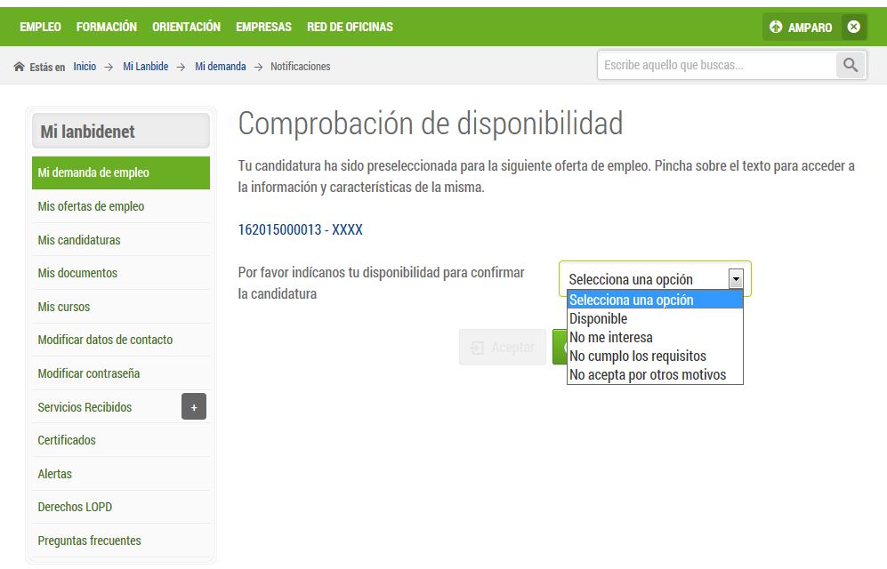 Cuando selecciones una notificación se te pedirá respuesta, es decir, contestar afirmativa o negativamente a la propuesta de empleo o formación que te hace Lanbide