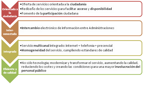 - Oferta un comportamiento homogéneo de la Administración de cara al ciudadano, con independencia de la organización interna y de las áreas o Departamentos implicados en la prestación
