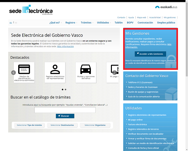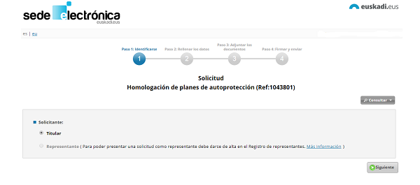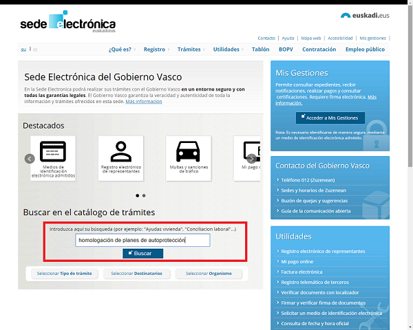 - Accede a la Sede Electrónica del Gobierno Vasco www.euskadi.eus. Puedes buscar el trámite en el catálogo de trámites introduciendo "homologación de planes de autoprotección".