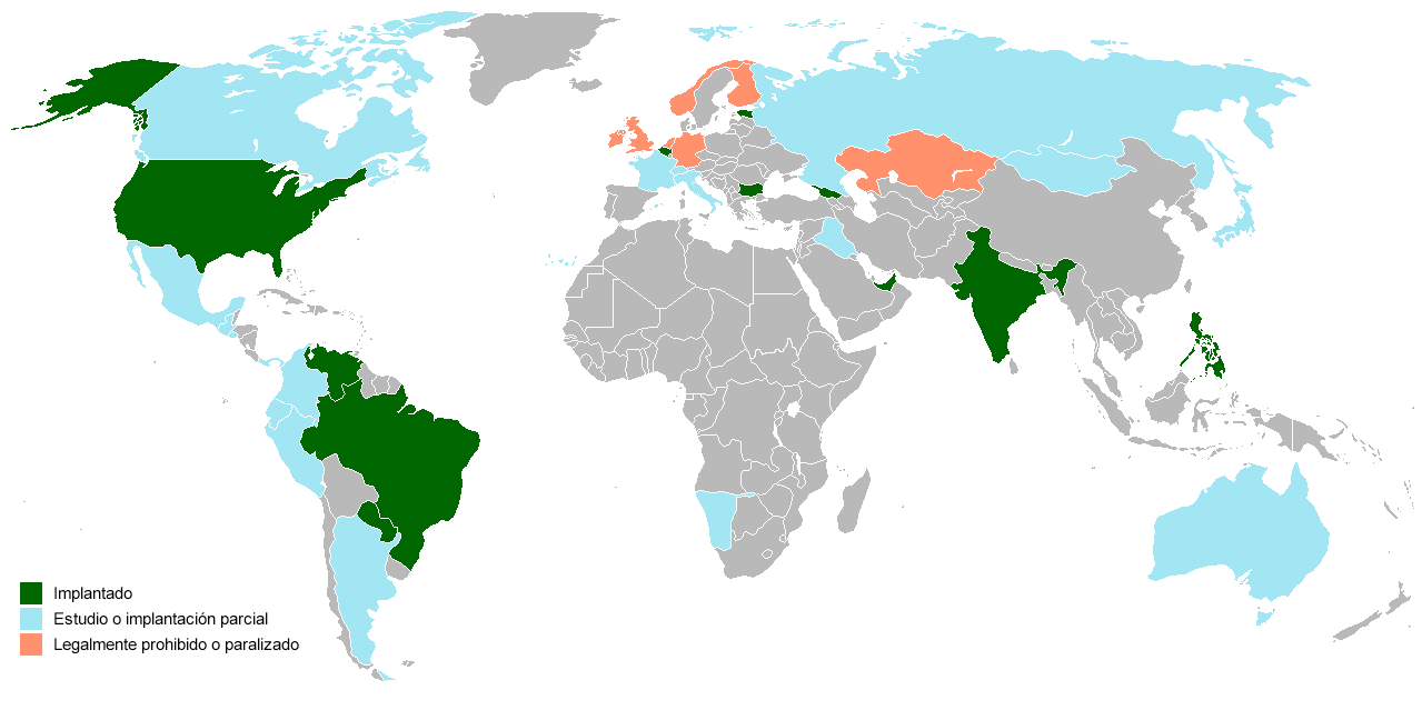 Se comunica de forma actualizada sobre la evolución y desarrollo del voto electrónico en el mundo distinguiendo entre países que lo tienen implantado, en estudio o implantación parcial o legalmente prohibido o paralizado.