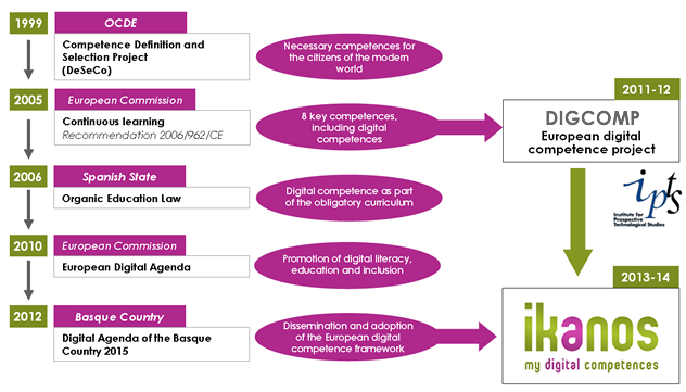 With an eminently open, participative and collaborative approach, IKANOS has, in this way, become a project designed to disseminate and promote the adoption in the Basque Country of the European digital competences framework , based on the implementation of the European DIGCOMP project , led and managed by the IPTS (Institute for Prospective Technological Studies) and validated by the European Commission in 2013.