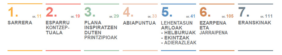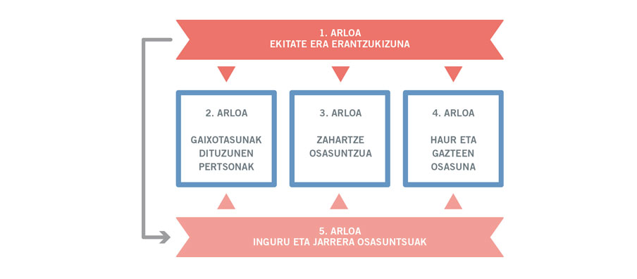 Kapitulu hau bost arlotan egituratzen da eta arlo bakoitzak berarekin lotutako helburuak, ekintzak eta adierazleak jaso-tzen ditu. 1 eta 5 arloak zeharkakoak dira, eta 2, 3 eta 4 arloak biztanleria-talde zehatzei buruzkoak.