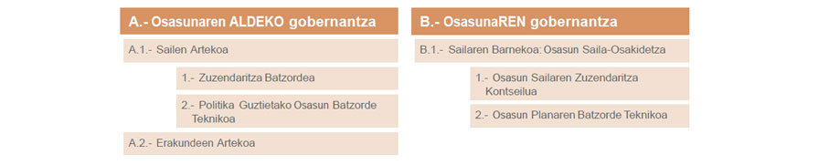 Lehendakaria burua den Batzorde Gidariak eta Politika Guztietako Osasun Batzorde Teknikoak zuzentzen dute Osasun Plana. Eusko Jaurlaritzako 14 arlok dute ordezkaritza batzorde horietan, sailburuordetza mailakoak.