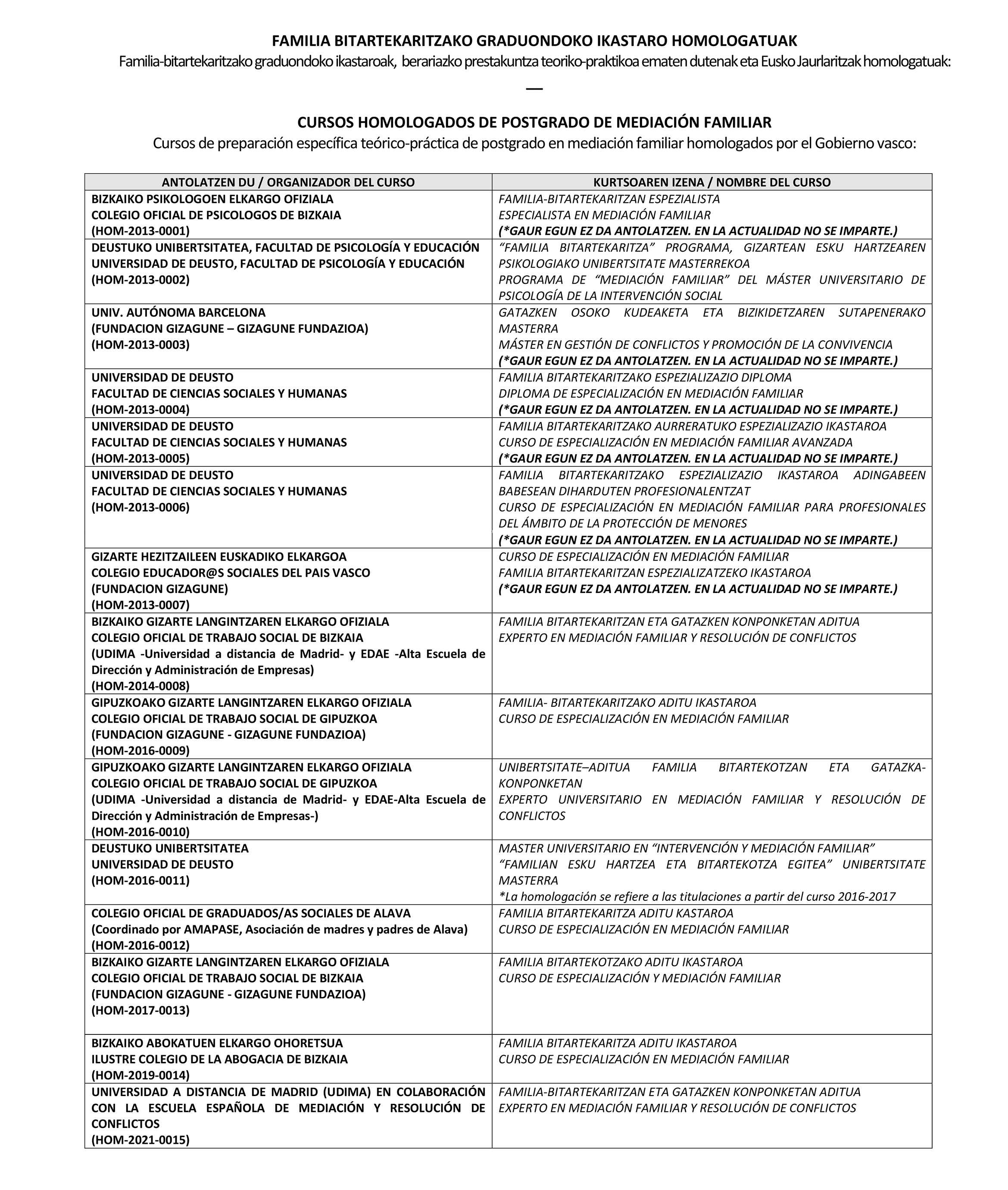 Familia-bitartekaritzako graduondoko ikastaroak (2023 urria eguneratua) (PDF, 664 KB) , berariazko prestakuntza teoriko-praktikoa ematen dutenak eta Eusko Jaurlaritzak homologatuak:
