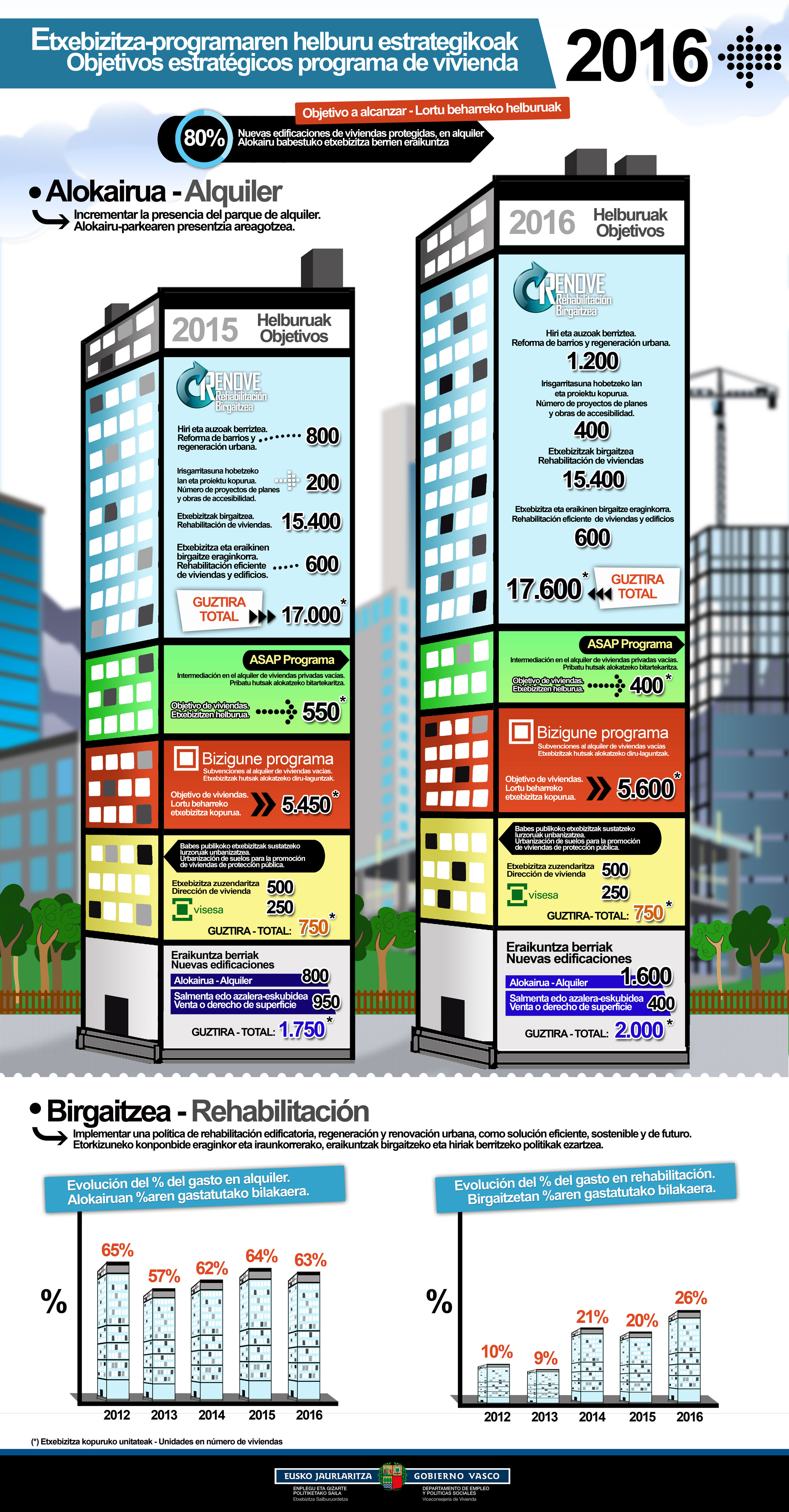 Azpimarratzekoa da, Etxebizitzaren Legeak eskatutakoari jarraituz eraikitako etxebizitza berrien % 80 alokairuan izango dela. Era berean ikus daiteke nola gastu osoaren % 63 alokairu-politiketara zuzentzen den, eta % 26 birgaitze politiketara. Infografian 2012-2016 bitarteko bilakaera ikus dezakegu.