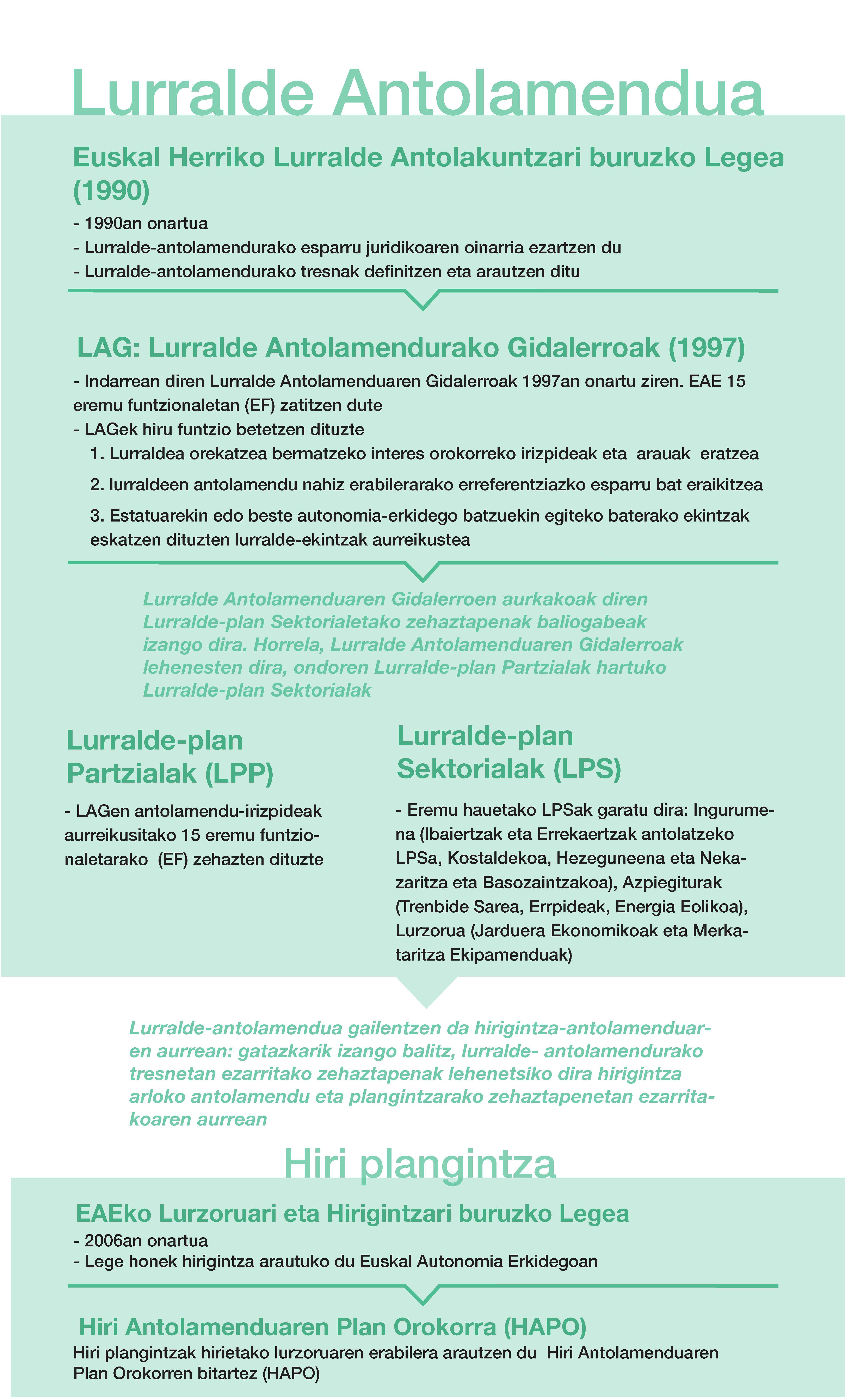LAGek, zehazki, naturaguneen babesa, bizitegi-gune edo industrialde handien kokapena edo birmoldaketa, zenbait azpiegitura handiren gutxi gorabeherako trazadura eta haiek lurraldean duten funtzioa (bideak, errepideak, trenbideak, portuak, aireportuak, eta abar), oro har, politika publikoen norabidea landa-eremuetan eta hiri-eremuetan, eta baita uraren zein energiaren kudeaketa ere, besteak beste, arautzen dituzte.
