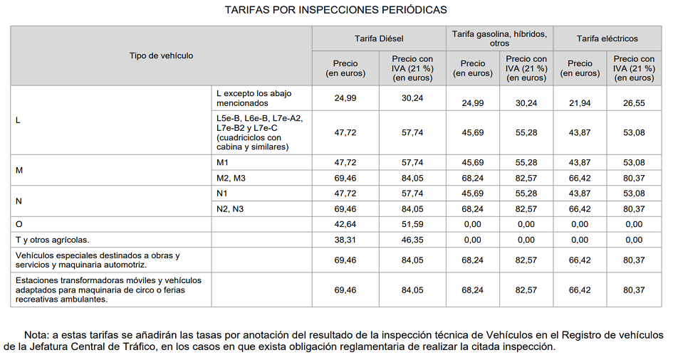 | Resto L: Vehículos de motor de dos o tres ruedas, gemelas o no, y cuadriciclos, destinados a circular por carretera, así como sus componentes o unidades técnicas. | Hasta 4 años: Exento. | De más de 4 años: Bienal | |