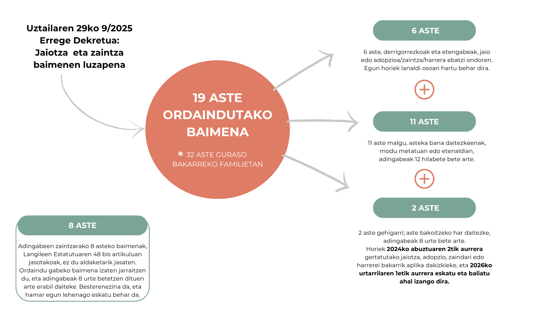 - 2 aste gehigarri (guraso bakarreko familietan 4 aste), gurasoen zaintzarako, astez gozatu daitezkeenak adingabeak 8 urte bete arte. 2 aste gehigarri hauek soilik aplikatzen dira 2024ko abuztuaren 2tik aurrera gertatutako jaiotza, adopzio, zaintza edo harrera kasuetan, eta 2026ko urtarrilaren 1etik aurrera eskatu eta baliatu ahal izango dira.