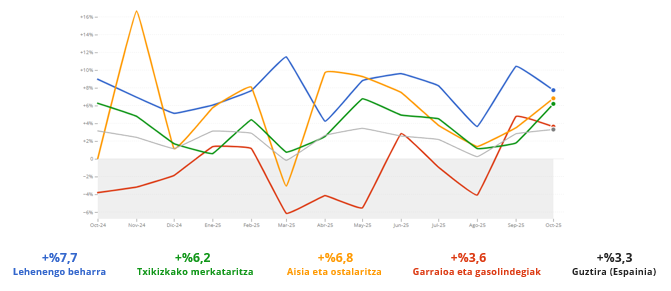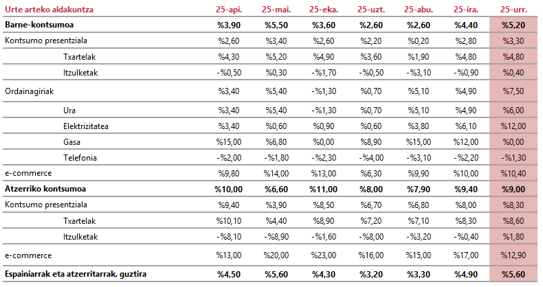 Bestalde, merkataritza elektronikoak bi digituko hazkundea izan du eta % 10,4ra iritsi da (0,4 p. gehiago). Ordainagirien bidezko kontsumoak ere bultzada handia izan du, % 7,5eko igoerarekin (irailean baino 2,6 p. gehiago).