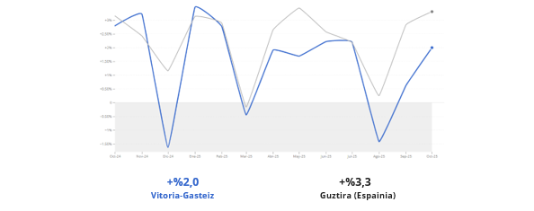 Bizkaia: Kontsumo presentziala urte arteko +%2,3 hazi zen Barakaldon, +%3,7 Basaurin, +%3,6 Bilbon, +%4,1 Getxon eta +%6,0 Portugaleten.