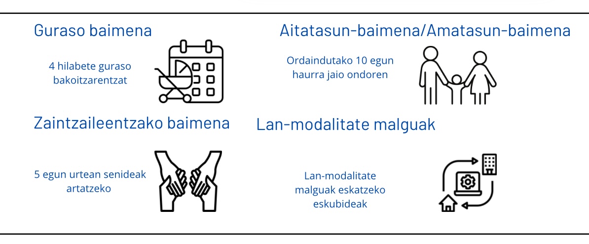 Azken urteotan, Europar Batasunak lan-bizitzaren eta bizitza pertsonalaren arteko kontziliazioa hobetzeko arau-esparrua garatu du. Eskubide Sozialen Europako Zutabea, Zainketen Europako Estrategia eta Genero Berdintasunerako Europako Estrategia gida tzat hartuta, kontziliazioaren arloko funtsezko arauetako bat onartu da: 2019/1158 (EB) Zuzentaraua, eta Europako politika horiek dira lan baimenen, genero berdintasunaren eta lan malguaren aldeko neurri berrien bultzatzaileak.